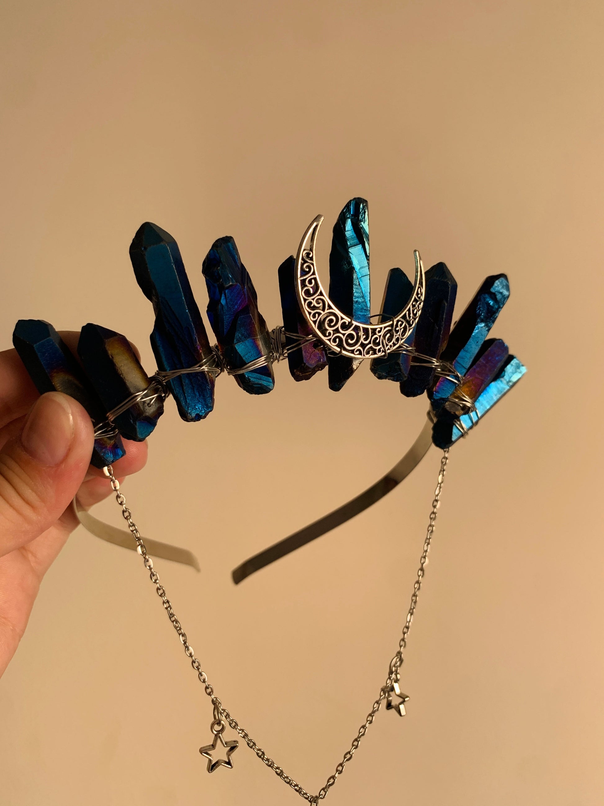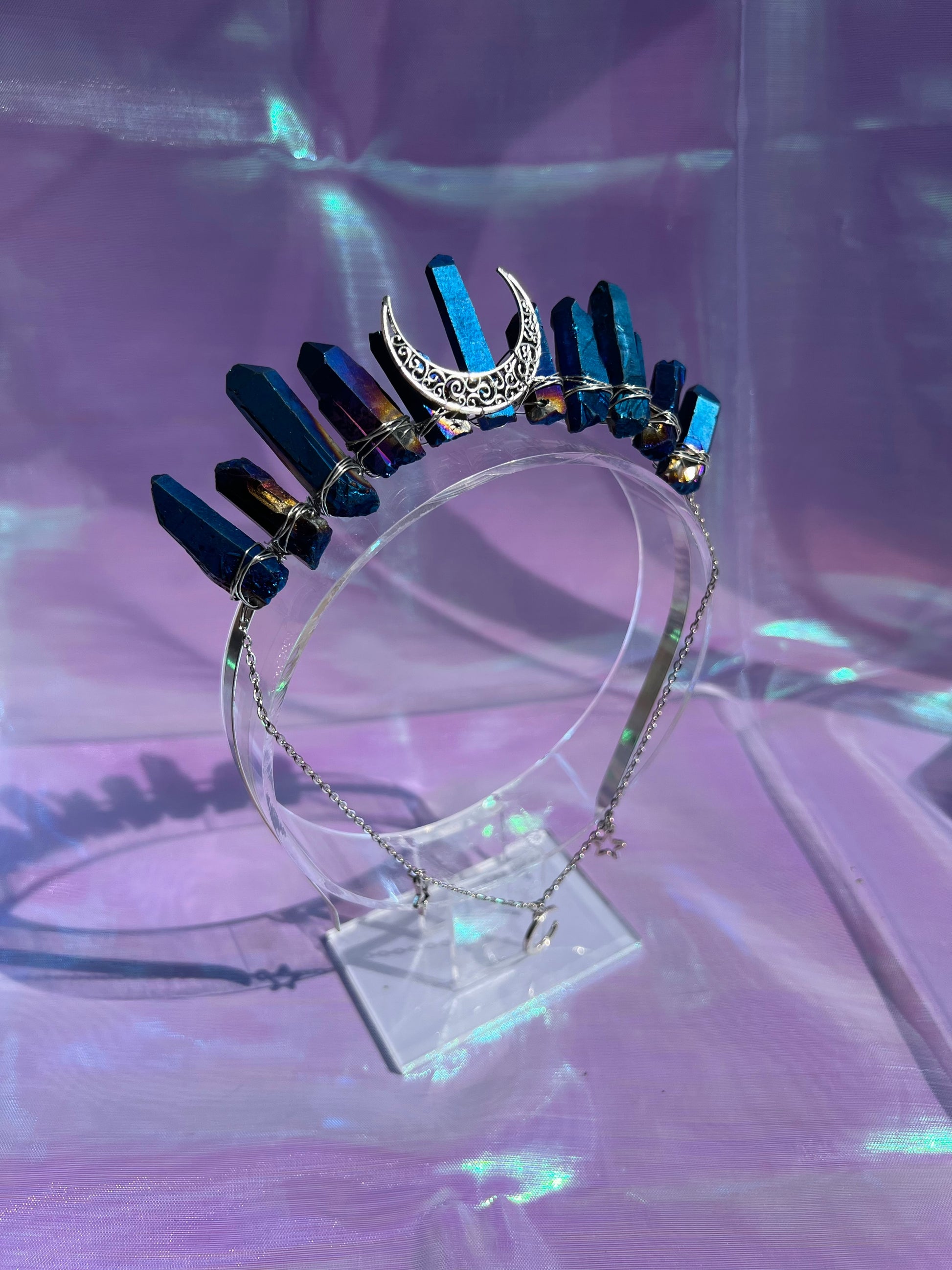 Blue Angel Aura crystal crown with silver wiring and with silver moon&sun chain and silver crescent moon!