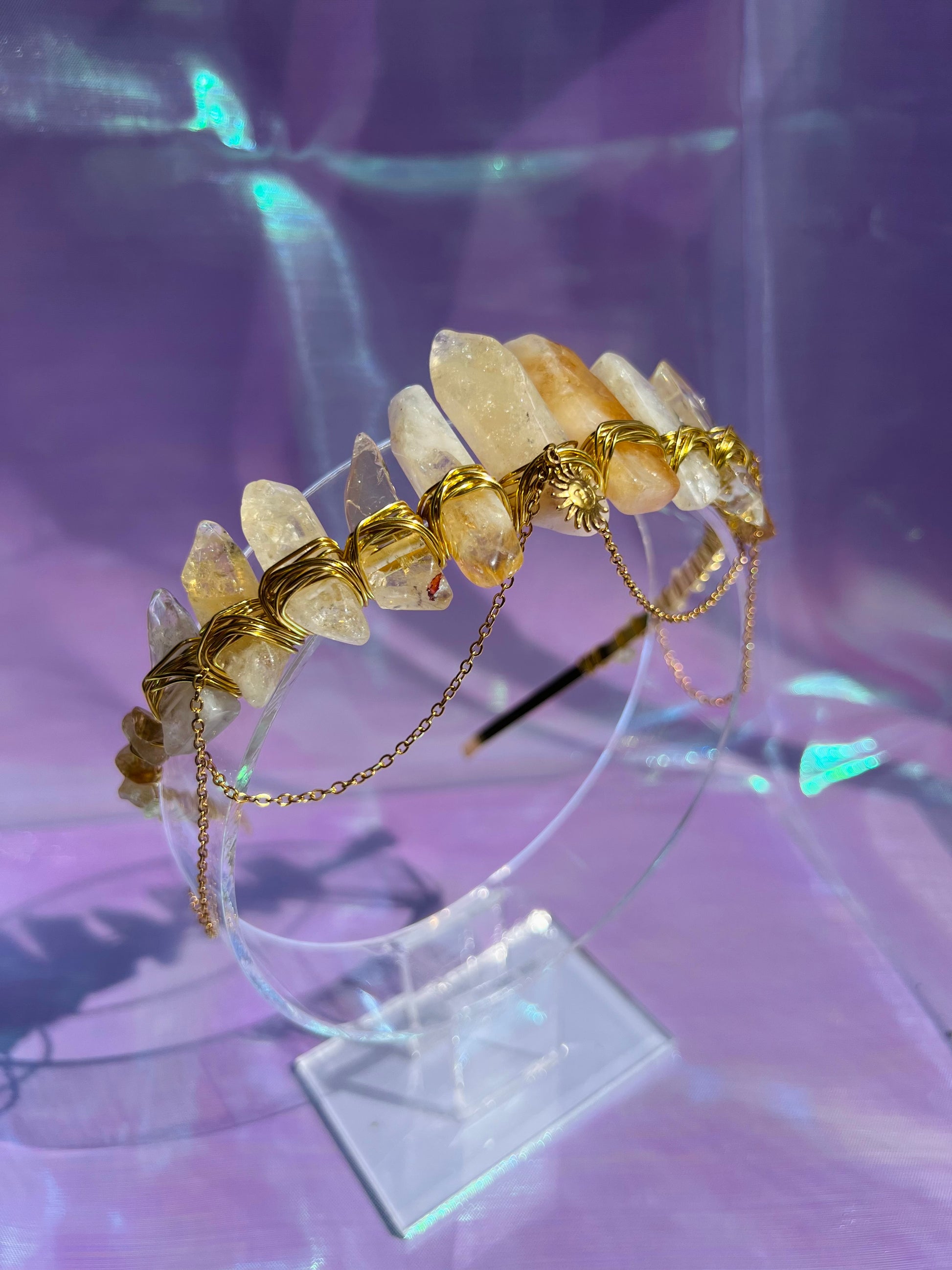 Citrine crystal crown with citrine crystal chips, gold wiring, gold chains and gold sun decor !